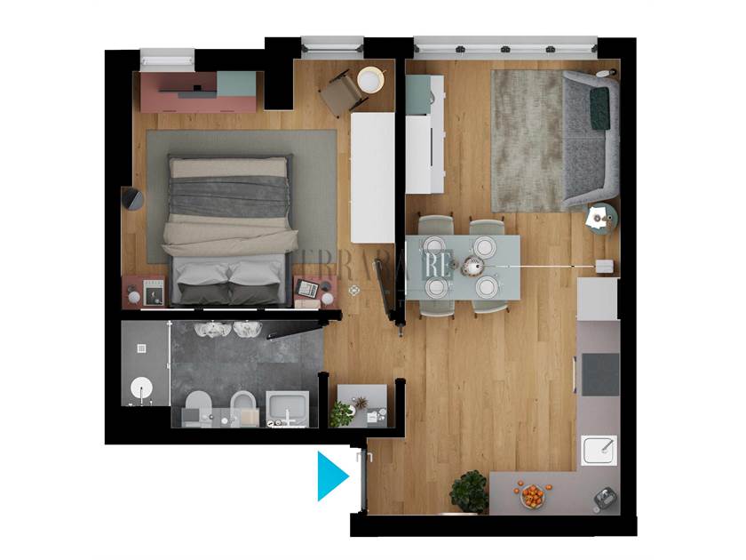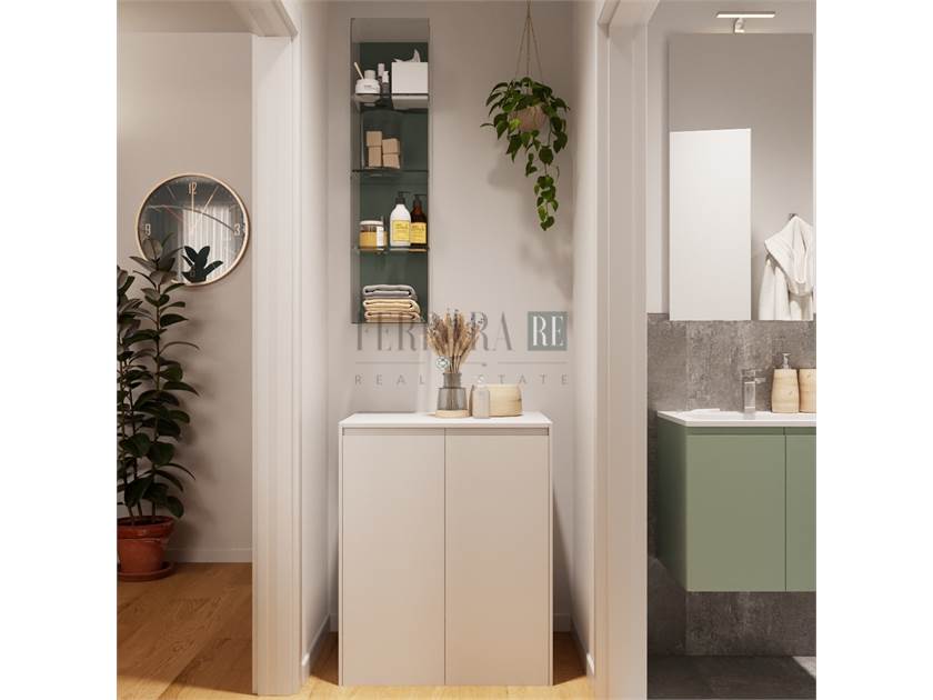 L'abitazione, con affaccio sul giardino interno, si presenta così: Ingresso sulla zona living con soggiorno, ampie finestre e cucina a vista, accesso al disimpegno, angolo lavanderia, zona notte con accesso al bagno e alla camera da letto.
