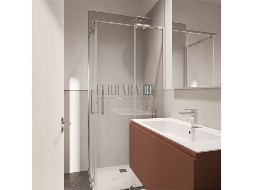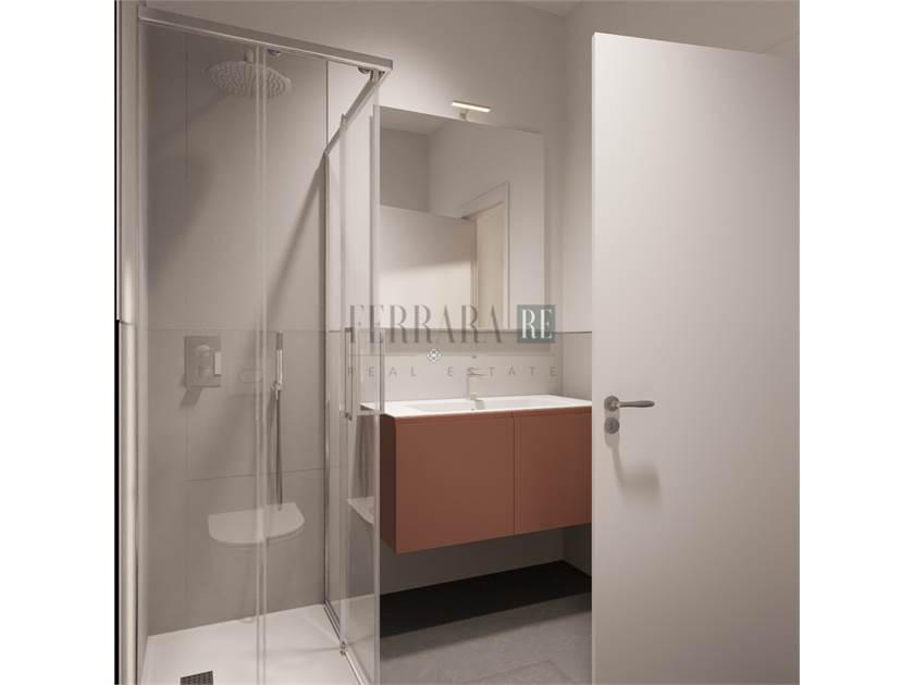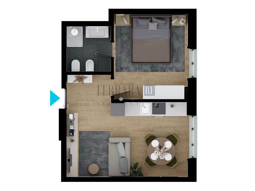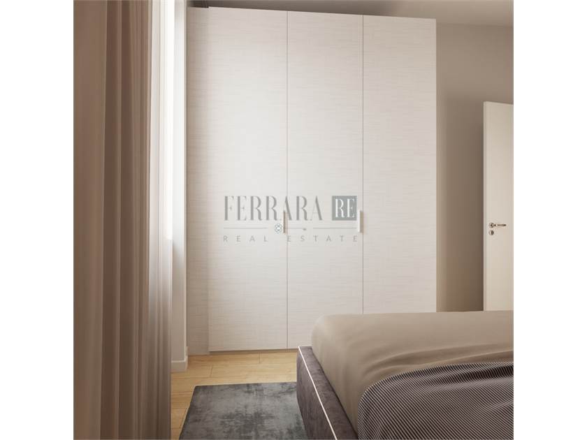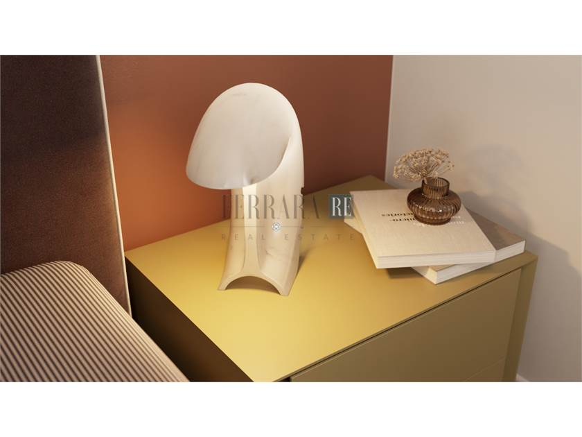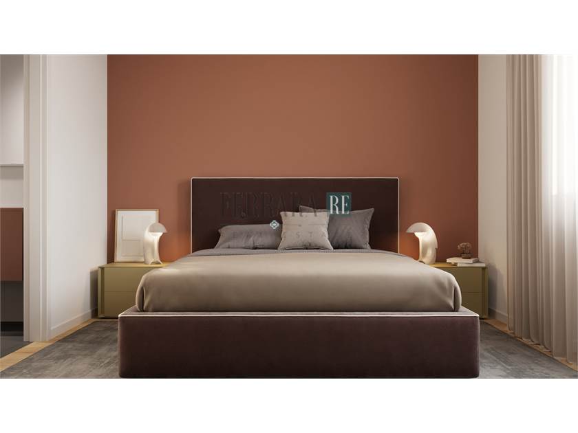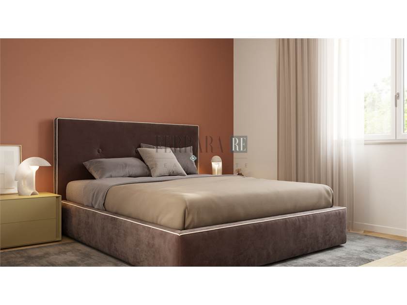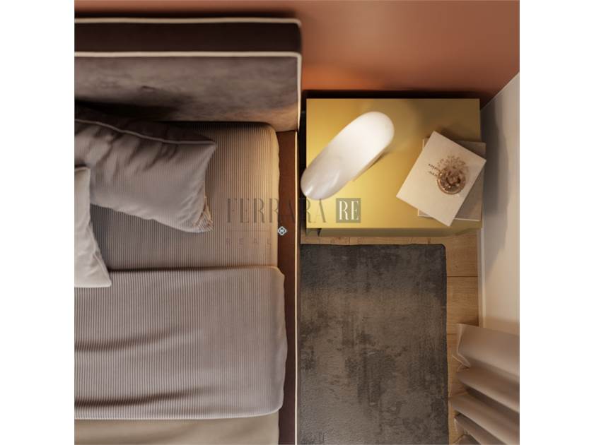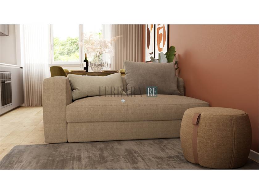 L’ingresso si apre su un disimpegno aperto e a destra sulla zona giorno con cucina a vista. Da qui l’accesso alla camera da letto matrimoniale con bagno en suite.