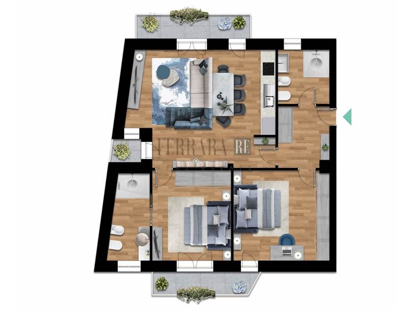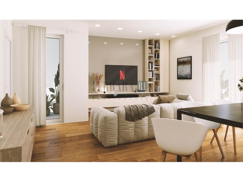 L'appartamento è composto da ingresso su ampia zona giorno con cucina a vista con doppio balcone, due bagni e due ampie camere matrimoniali con balcone.